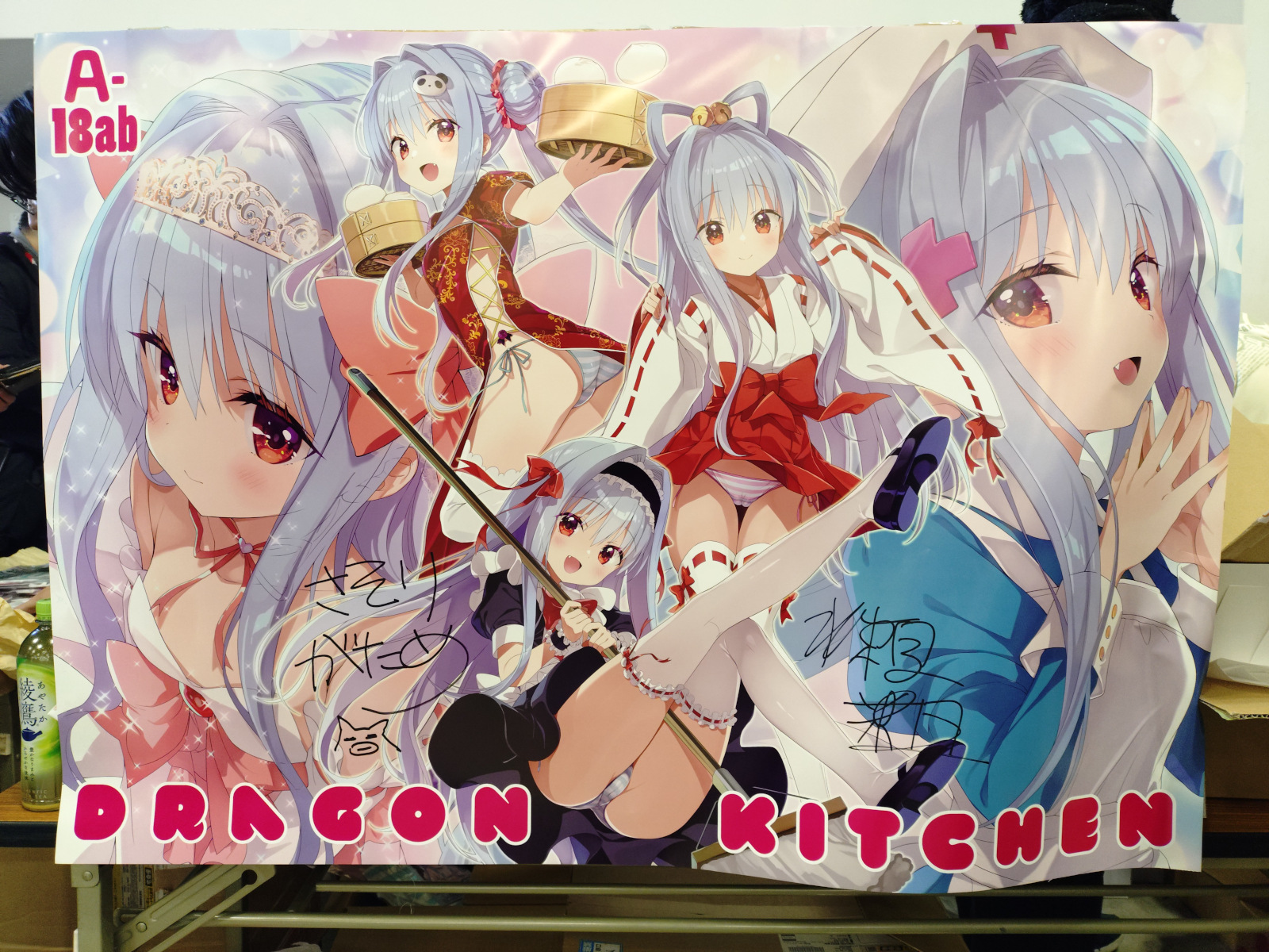 Dragon Kitchenの、さそりがため先生と水瀬葉月先生のサイン入りポスターを撮影。