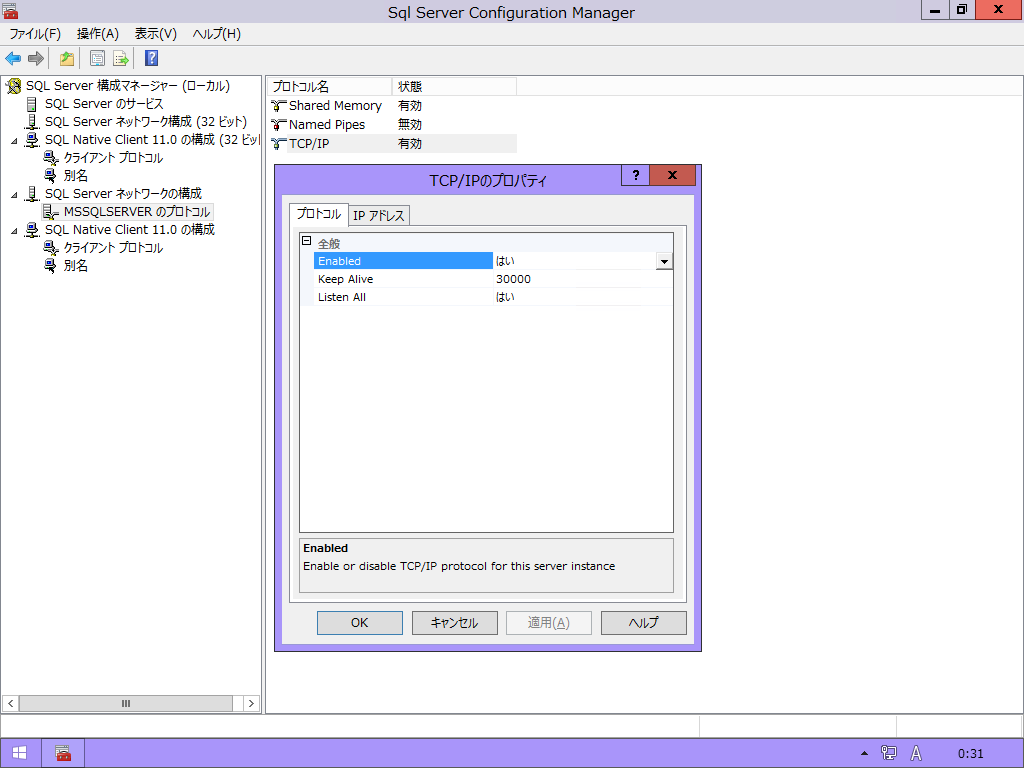 SQL Serverのネットワーク構成を変更し、TCP/IP接続を有効化する。