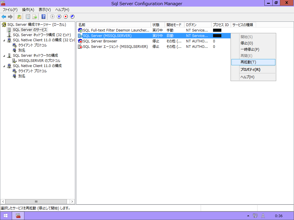 TCP/IP接続の設定変更をしただけではTCP/IP接続が有効にならないので、DBの再起動も実施する。