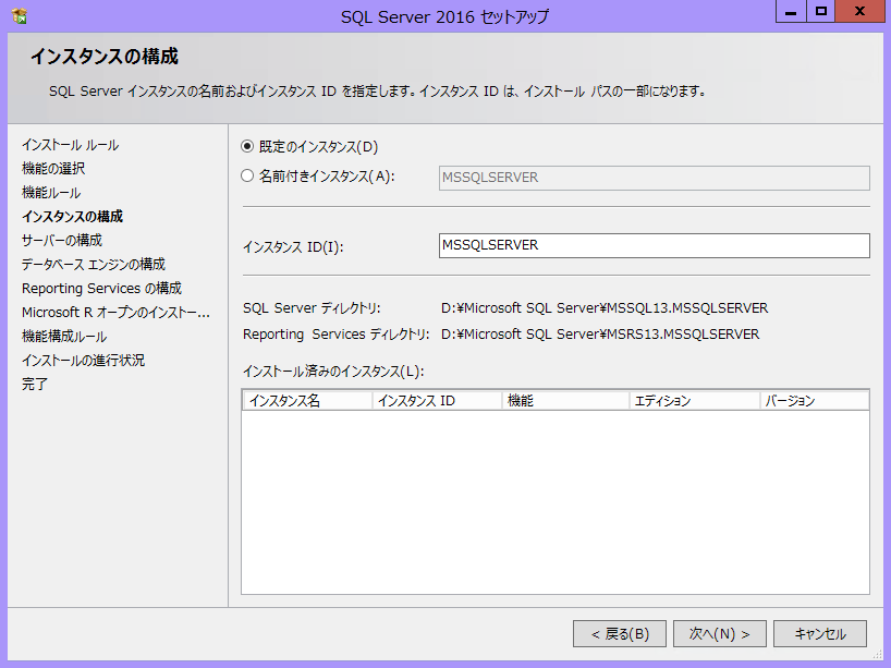 [インストール用TEMP]: C:\SQLServer2016Media [DBデータディレクトリ]: D:\Microsoft SQL Server [インスタンス構成]: 既定のインスタンス